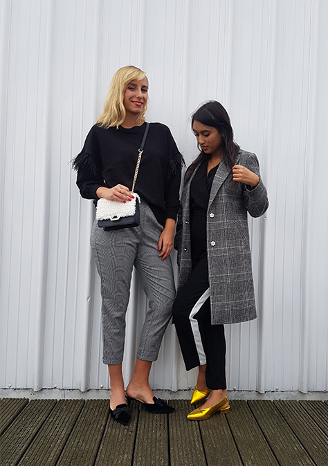 Sam wears: Jumper and trousers, both Stradivarius ; bag, Topshop and shoes, Marks and Spencer. Cigdem wears: coat, New look; jumpsuit, Zara and shoes, Kurt Geiger